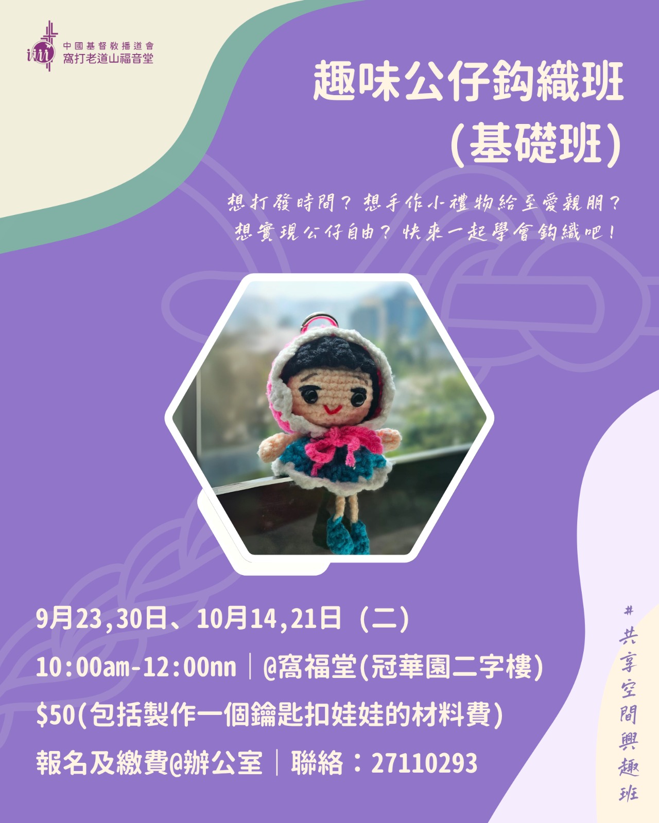 為弟兄姊妹及鄰舍提供一個彼此連結的空間,發掘樂趣,建立友誼,分享生命。期盼這裏成為一個可以自在地獨樂樂,也可熱鬧地眾樂樂的舒適空間。邀請你來一同享受!「這樣,你們不再是外人或客旅,是與聖徒同國,是上帝家裏的人了」(以弗所書二19) 開放時間星期二:14:00-17:00星期四/六:10:00-14:00 甚麼人可以來? — 歡迎弟兄姊妹和街坊朋友們! 這裏有甚麼設備? — 設有桌遊康樂棋、報章刊物、血壓計、體重磅、飲品小食等 這裏會有甚麼發生? — 興趣班:例如國畫、地壺— 興趣小組:例如乒乓球— 不定期的特備活動,敬請期待(笑)— 個人獨處— 休憩聊天 最近會有甚麼興趣班? 共享空間開放日 肌肉鍛鍊班 趣味公仔鈎織班 插花班 我想回顧以前的活動!