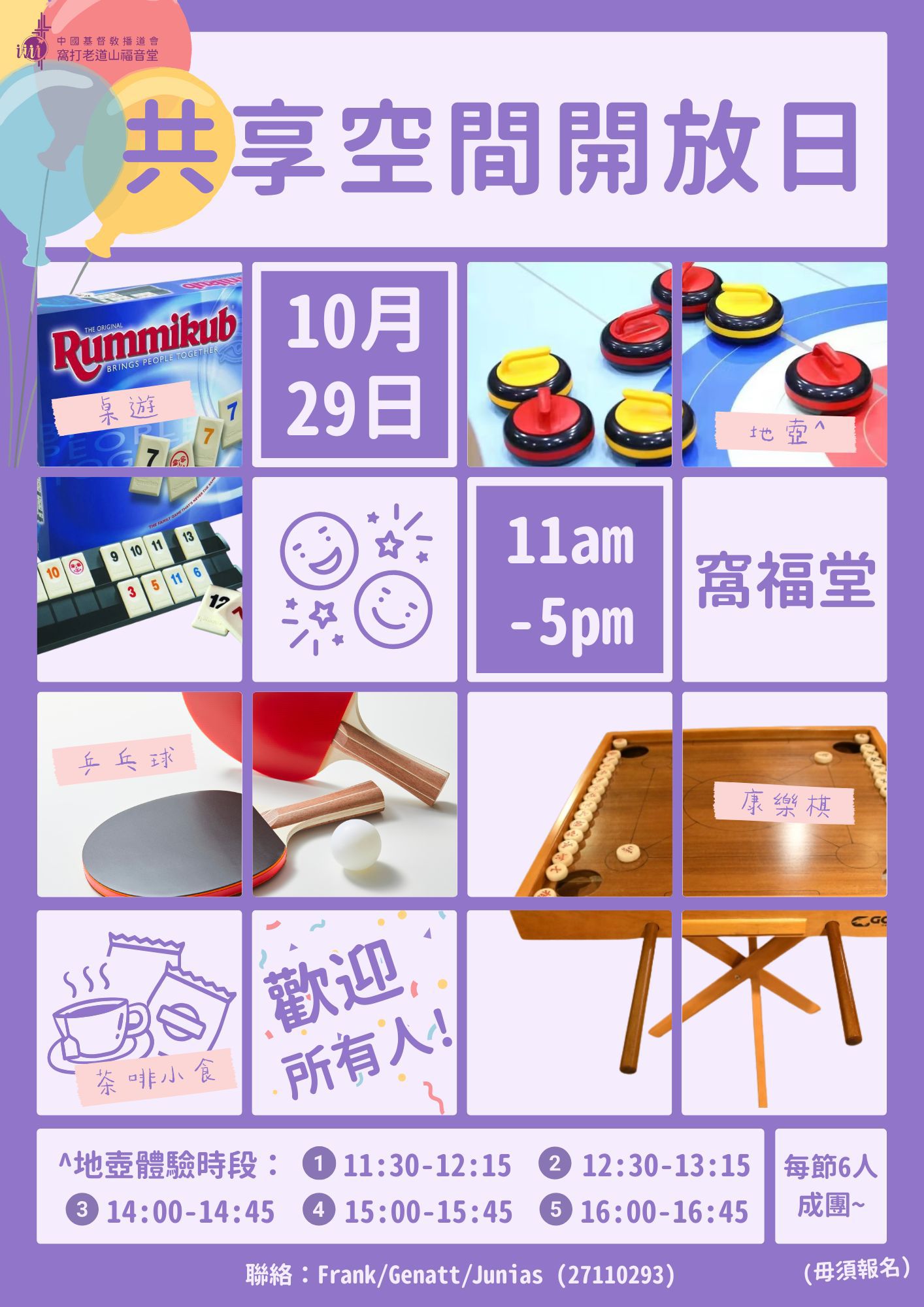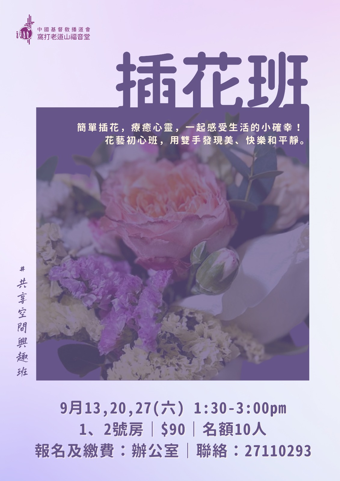 為弟兄姊妹及鄰舍提供一個彼此連結的空間,發掘樂趣,建立友誼,分享生命。期盼這裏成為一個可以自在地獨樂樂,也可熱鬧地眾樂樂的舒適空間。邀請你來一同享受!「這樣,你們不再是外人或客旅,是與聖徒同國,是上帝家裏的人了」(以弗所書二19) 開放時間星期二:14:00-17:00星期四/六:10:00-14:00 甚麼人可以來? — 歡迎弟兄姊妹和街坊朋友們! 這裏有甚麼設備? — 設有桌遊康樂棋、報章刊物、血壓計、體重磅、飲品小食等 這裏會有甚麼發生? — 興趣班:例如國畫、地壺— 興趣小組:例如乒乓球— 不定期的特備活動,敬請期待(笑)— 個人獨處— 休憩聊天 最近會有甚麼興趣班? 共享空間開放日 肌肉鍛鍊班 趣味公仔鈎織班 插花班 我想回顧以前的活動!