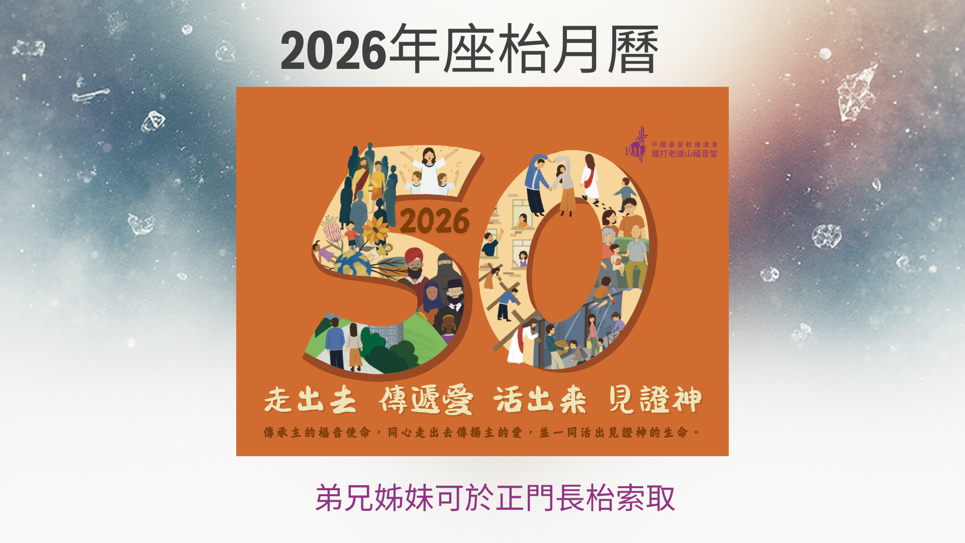 2025-11-14 創作意念:由10月份起,教會主題為「走出去,傳遞愛;活出來,見證神」,期盼弟兄姊妹能盡心、盡性、盡意、盡力去愛主—我們的上帝,也讓我們傳承主在過去五十載賜予窩福的福音使命,同心走出去傳揚主的愛,並一同活出見證神的生命;向家人、朋友、鄰舍,以及跨文化、跨地域的人分享福音,愛鄰如己,將身體獻上當作活祭來回應主的愛。弟兄姊妹可於正門長枱索取。 行政消息
