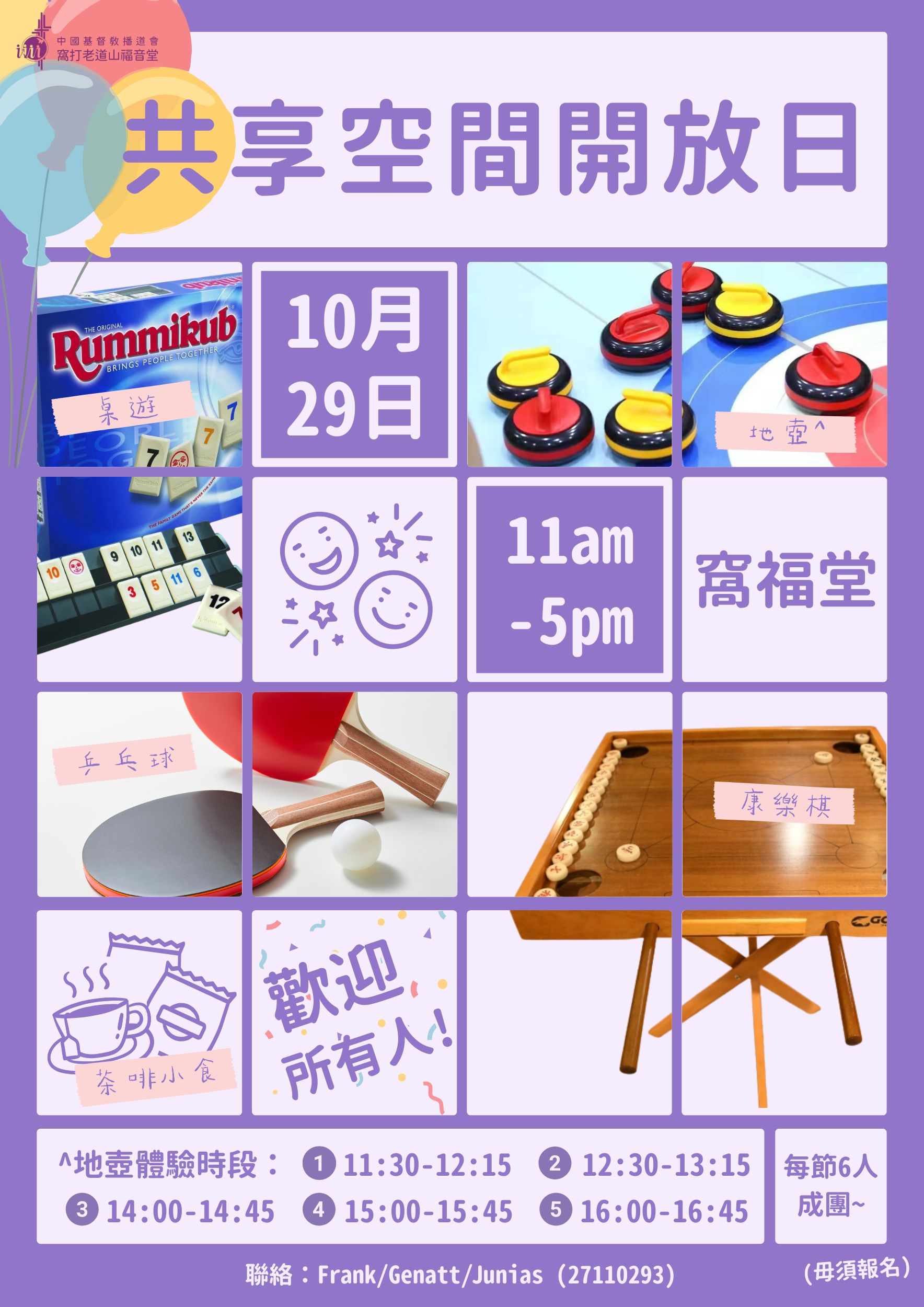 2025-10-21 一個彼此連結、發掘樂趣、建立友誼、分享生命的空間,期盼這裏成為一個可以自在地獨樂樂、也熱鬧地眾樂樂的地方。邀請你一同來Enjoy!日期:10月29日(星期三,重陽節假期)時間:上午11:00至下午5:00對象:歡迎所有弟兄姊妹、街坊、朋友到訪參與。內容:共享活動(包括乒乓球、地壺、桌遊)及休閒空間。查詢:伍國榮傳道、翁曉怡傳道、李頌華傳道(電話:27110293) 教會活動